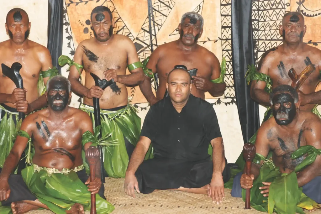 Members of the bati, or warrior clan, stand guard over the entrance to a chiefly bure during a ceremonial occasion.
