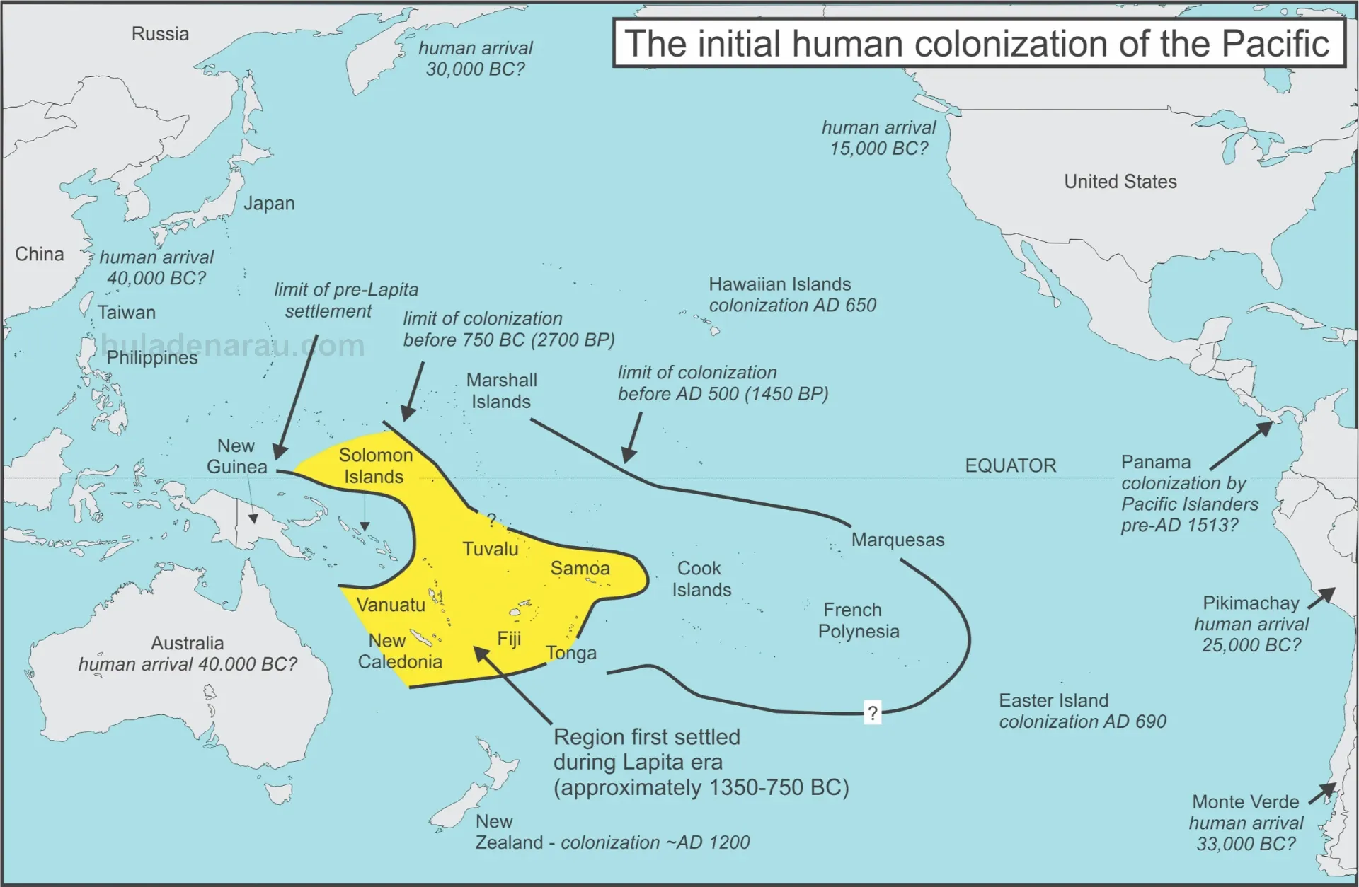 Subsequently the same style of pottery was discovered in sites leading from New Guinea via the Bismarck Archipelago to the Solomon Islands and the New Hebrides (Vanuatu) and New Caledonia before making a gigantic leap of 1200 kilometers across open ocean to Fiji, and subsequently to Tonga, Samoa and to a singular discovery in the Marquesas Islands in Eastern Polynesia.