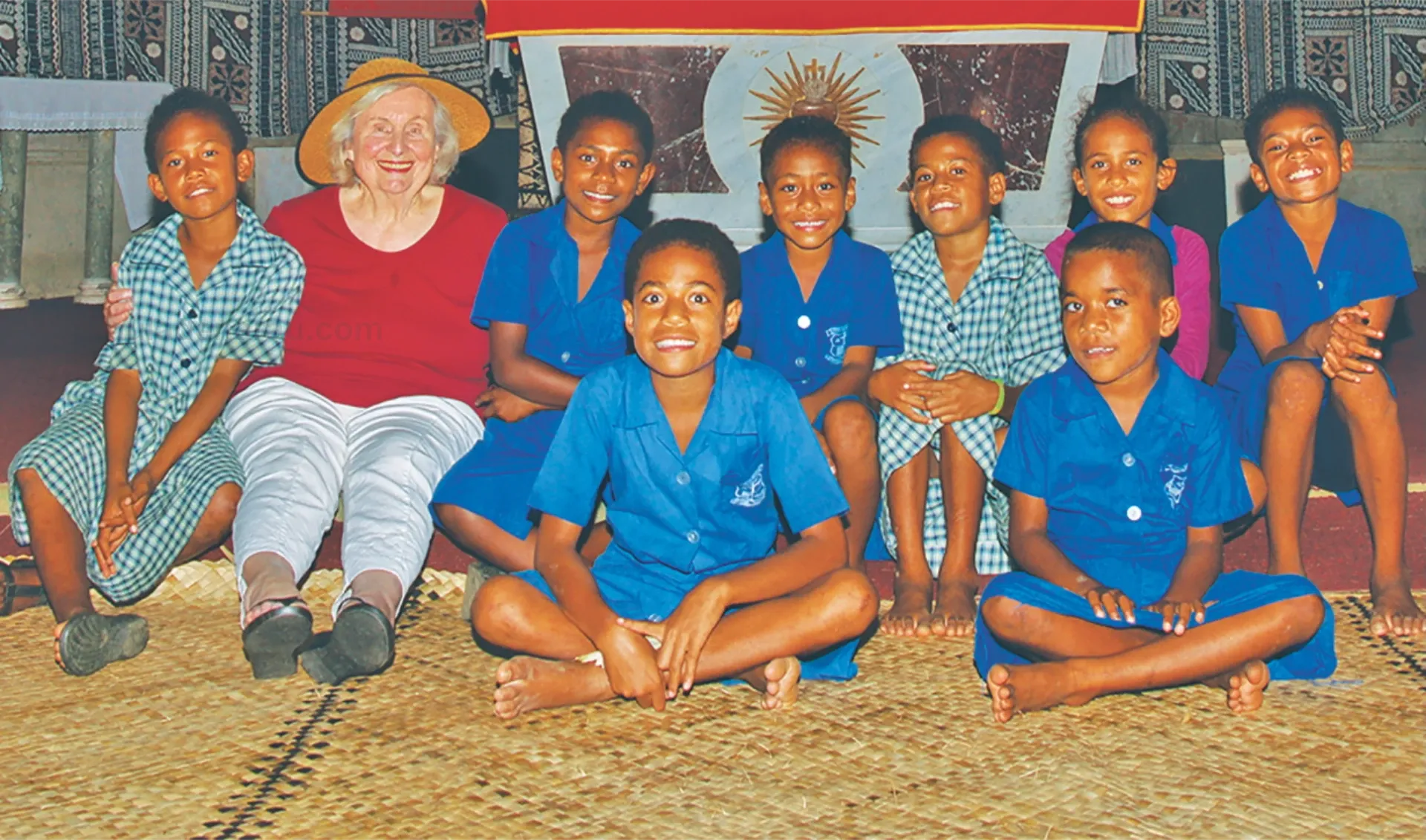 Judy Siers with children after school at the famous Church of St. Francis Xavier in Naiserelagi, Rakiraki. The church contains world famous frescoes made by Jean Charlot.